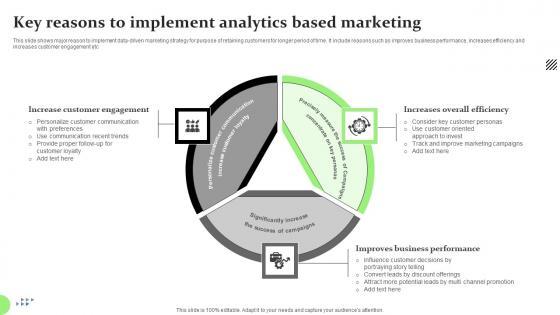 This slide shows major reason to implement data driven marketing strategy for purpose of retaining customers for longer period of time. It include reasons such as improves business performance, increases efficiency and increases customer engagement etc.Pitch your topic with ease and precision using this Key Reasons To Implement Analytics Based Marketing Diagrams Pdf This layout presents information on Increase Customer Engagement, Increases Overall Efficiency, Improves Business Performance It is also available for immediate download and adjustment. So, changes can be made in the color, design, graphics or any other component to create a unique layout. This slide shows major reason to implement data driven marketing strategy for purpose of retaining customers for longer period of time. It include reasons such as improves business performance, increases efficiency and increases customer engagement etc.