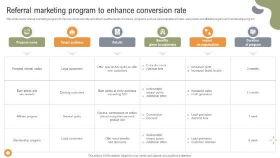 This slide covers referral marketing program to improve conversion rate and attract qualified leads. It involves programs such as, personal referral codes, earn points and affiliate program and membership program. Slidegeeks is one of the best resources for PowerPoint templates. You can download easily and regulate Implementing Strategies To Enhance Referral Marketing Program To Enhance Conversion Rate for your personal presentations from our wonderful collection. A few clicks is all it takes to discover and get the most relevant and appropriate templates. Use our Templates to add a unique zing and appeal to your presentation and meetings. All the slides are easy to edit and you can use them even for advertisement purposes. This slide covers referral marketing program to improve conversion rate and attract qualified leads. It involves programs such as, personal referral codes, earn points and affiliate program and membership program.
