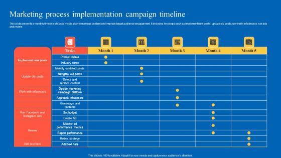 This slide presents a monthly timeline of social media plan to manage content and improve target audience engagement. It includes key steps such as implement new posts, update old posts, work with influencers, run ads and review. Slidegeeks has constructed Marketing Process Implementation Strategic Guide For Marketing Program Professional Pdf after conducting extensive research and examination. These presentation templates are constantly being generated and modified based on user preferences and critiques from editors. Here, you will find the most attractive templates for a range of purposes while taking into account ratings and remarks from users regarding the content. This is an excellent jumping off point to explore our content and will give new users an insight into our top notch PowerPoint Templates. This slide presents a monthly timeline of social media plan to manage content and improve target audience engagement. It includes key steps such as implement new posts, update old posts, work with influencers, run ads and review.