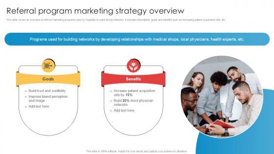 This slide covers an overview of referral marketing programs used by hospitals to build strong networks. It includes description, goals and benefits such as increasing patient acquisition rate, etc. Whether you have daily or monthly meetings, a brilliant presentation is necessary. Referral Program Marketing Strategy Overview Implementation Of Online Ppt Sample can be your best option for delivering a presentation. Represent everything in detail using Referral Program Marketing Strategy Overview Implementation Of Online Ppt Sample and make yourself stand out in meetings. The template is versatile and follows a structure that will cater to your requirements. All the templates prepared by Slidegeeks are easy to download and edit. Our research experts have taken care of the corporate themes as well. So, give it a try and see the results. This slide covers an overview of referral marketing programs used by hospitals to build strong networks. It includes description, goals and benefits such as increasing patient acquisition rate, etc.