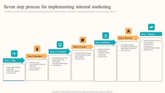 This slide shows process which can be used by marketing managers to implement internal marketing in organization. It includes stages such as align, introduce, coordinate, create, etc. Are you searching for a Seven Step Process Implementing Developing Employee Centric Marketing Program Ideas Pdf that is uncluttered, straightforward, and original Its easy to edit, and you can change the colors to suit your personal or business branding. For a presentation that expresses how much effort you have put in, this template is ideal With all of its features, including tables, diagrams, statistics, and lists, its perfect for a business plan presentation. Make your ideas more appealing with these professional slides. Download Seven Step Process Implementing Developing Employee Centric Marketing Program Ideas Pdf from Slidegeeks today. This slide shows process which can be used by marketing managers to implement internal marketing in organization. It includes stages such as align, introduce, coordinate, create, etc.