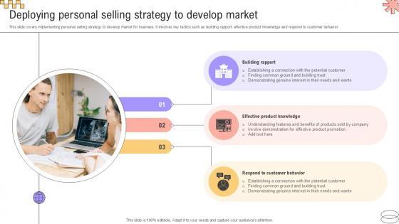 This slide covers implementing personal selling strategy to develop market for business. It involves key tactics such as building rapport, effective product knowledge and respond to customer behavior. Present like a pro with Deploying Personal Selling Implementing Geographic Extension PPT Slide Strategy SS V. Create beautiful presentations together with your team, using our easy-to-use presentation slides. Share your ideas in real-time and make changes on the fly by downloading our templates. So whether you are in the office, on the go, or in a remote location, you can stay in sync with your team and present your ideas with confidence. With Slidegeeks presentation got a whole lot easier. Grab these presentations today. This slide covers implementing personal selling strategy to develop market for business. It involves key tactics such as building rapport, effective product knowledge and respond to customer behavior