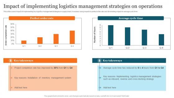This slide covers impact of implementing key logistics management strategies in supply chain. It involves rising impact on perfect order rate and diminishing impact on average cycle time. Whether you have daily or monthly meetings, a brilliant presentation is necessary. Impact Of Implementing Logistics Advanced Supply Chain Improvement Strategies Rules Pdf can be your best option for delivering a presentation. Represent everything in detail using Impact Of Implementing Logistics Advanced Supply Chain Improvement Strategies Rules Pdf and make yourself stand out in meetings. The template is versatile and follows a structure that will cater to your requirements. All the templates prepared by Slidegeeks are easy to download and edit. Our research experts have taken care of the corporate themes as well. So, give it a try and see the results. This slide covers impact of implementing key logistics management strategies in supply chain. It involves rising impact on perfect order rate and diminishing impact on average cycle time.