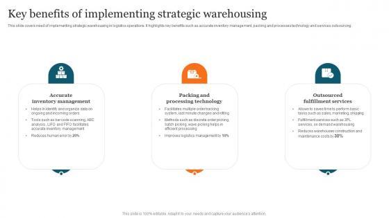 This slide covers need of implementing strategic warehousing in logistics operations. It highlights key benefits such as accurate inventory management, packing and processes technology and services outsourcing. Find highly impressive Key Benefits Of Implementing Advanced Supply Chain Improvement Strategies Diagrams Pdf on Slidegeeks to deliver a meaningful presentation. You can save an ample amount of time using these presentation templates. No need to worry to prepare everything from scratch because Slidegeeks experts have already done a huge research and work for you. You need to download Key Benefits Of Implementing Advanced Supply Chain Improvement Strategies Diagrams Pdf for your upcoming presentation. All the presentation templates are 100 percent editable and you can change the color and personalize the content accordingly. Download now This slide covers need of implementing strategic warehousing in logistics operations. It highlights key benefits such as accurate inventory management, packing and processes technology and services outsourcing.