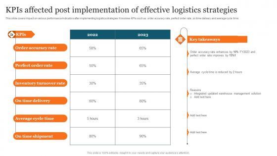 This slide covers impact on various performance indicators after implementing logistics strategies. It involves KPIs such as order accuracy rate, perfect order rate, on time delivery and average cycle time. Are you in need of a template that can accommodate all of your creative concepts This one is crafted professionally and can be altered to fit any style. Use it with Google Slides or PowerPoint. Include striking photographs, symbols, depictions, and other visuals. Fill, move around, or remove text boxes as desired. Test out color palettes and font mixtures. Edit and save your work, or work with colleagues. Download KPIs Affected Post Implementation Advanced Supply Chain Improvement Strategies Rules Pdf and observe how to make your presentation outstanding. Give an impeccable presentation to your group and make your presentation unforgettable. This slide covers impact on various performance indicators after implementing logistics strategies. It involves KPIs such as order accuracy rate, perfect order rate, on time delivery and average cycle time.