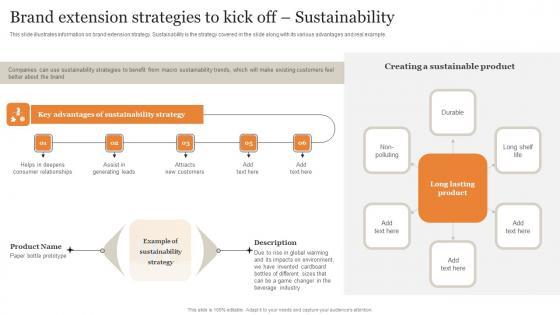 This slide illustrates information on brand extension strategy. Sustainability is the strategy covered in the slide along with its various advantages and real example. Find highly impressive Brand Extension Strategies To Kick Off Sustainability Ultimate Guide Implementing Brochure Pdf on Slidegeeks to deliver a meaningful presentation. You can save an ample amount of time using these presentation templates. No need to worry to prepare everything from scratch because Slidegeeks experts have already done a huge research and work for you. You need to download Brand Extension Strategies To Kick Off Sustainability Ultimate Guide Implementing Brochure Pdf for your upcoming presentation. All the presentation templates are 100 percent editable and you can change the color and personalize the content accordingly. Download now. This slide illustrates information on brand extension strategy. Sustainability is the strategy covered in the slide along with its various advantages and real example.