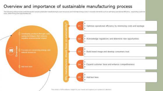 The following slide provides brief introduction about sustainable manufacturing to save resources and minimize energy costs. It includes elements such as optimizing operational efficiency , expanding customer base, determining new opportunities etc. Explore a selection of the finest Overview And Importance Of Sustainable Implementing Manufacturing Strategy SS V here. With a plethora of professionally designed and pre-made slide templates, you can quickly and easily find the right one for your upcoming presentation. You can use our Overview And Importance Of Sustainable Implementing Manufacturing Strategy SS V to effectively convey your message to a wider audience. Slidegeeks has done a lot of research before preparing these presentation templates. The content can be personalized and the slides are highly editable. Grab templates today from Slidegeeks. The following slide provides brief introduction about sustainable manufacturing to save resources and minimize energy costs. It includes elements such as optimizing operational efficiency , expanding customer base, determining new opportunities etc.