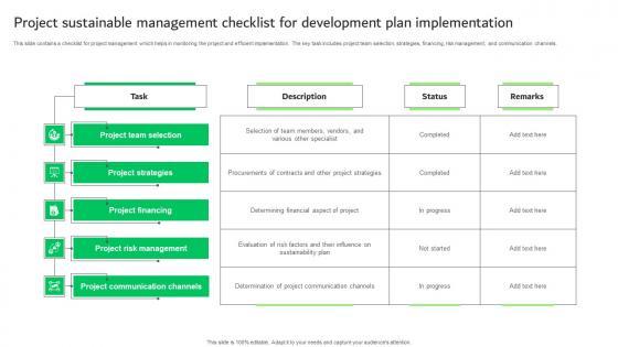 This slide contains a checklist for project management which helps in monitoring the project and efficient implementation. The key task includes project team selection, strategies, financing, risk management, and communication channels. Pitch your topic with ease and precision using this Project Sustainable Management Checklist For Development Plan Implementation Template Pdf. This layout presents information on Project Team Selection, Project Strategies, Project Financing. It is also available for immediate download and adjustment. So, changes can be made in the color, design, graphics or any other component to create a unique layout. This slide contains a checklist for project management which helps in monitoring the project and efficient implementation. The key task includes project team selection, strategies, financing, risk management, and communication channels.