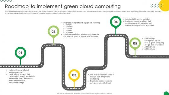 This slide outlines the roadmap to implement green cloud computing in the organization. The purpose of this slide is to showcase the various steps organizations should take while deploying green cloud computing, including implementing energy-efficient building systems, installing power-efficient lighting systems, etc. If you are looking for a format to display your unique thoughts, then the professionally designed Sustainable Roadmap To Implement Green Cloud Computing is the one for you. You can use it as a Google Slides template or a PowerPoint template. Incorporate impressive visuals, symbols, images, and other charts. Modify or reorganize the text boxes as you desire. Experiment with shade schemes and font pairings. Alter, share or cooperate with other people on your work. Download Sustainable Roadmap To Implement Green Cloud Computing and find out how to give a successful presentation. Present a perfect display to your team and make your presentation unforgettable. This slide outlines the roadmap to implement green cloud computing in the organization. The purpose of this slide is to showcase the various steps organizations should take while deploying green cloud computing, including implementing energy-efficient building systems, installing power-efficient lighting systems, etc.