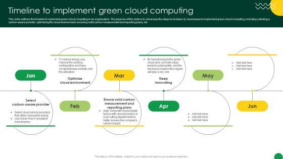 This slide outlines the timeline to implement green cloud computing in an organization. The purpose of this slide is to showcase the steps to be taken by businesses to implement green cloud computing, including selecting a carbon-aware provider, optimizing the cloud environment, ensuring solid carbon measurement and reporting plans, etc. Coming up with a presentation necessitates that the majority of the effort goes into the content and the message you intend to convey. The visuals of a PowerPoint presentation can only be effective if it supplements and supports the story that is being told. Keeping this in mind our experts created Sustainable Timeline To Implement Green Cloud Computing to reduce the time that goes into designing the presentation. This way, you can concentrate on the message while our designers take care of providing you with the right template for the situation. This slide outlines the timeline to implement green cloud computing in an organization. The purpose of this slide is to showcase the steps to be taken by businesses to implement green cloud computing, including selecting a carbon-aware provider, optimizing the cloud environment, ensuring solid carbon measurement and reporting plans, etc.