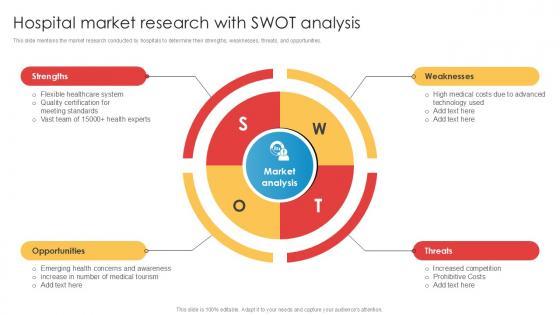 This slide mentions the market research conducted by hospitals to determine their strengths, weaknesses, threats, and opportunities. Coming up with a presentation necessitates that the majority of the effort goes into the content and the message you intend to convey. The visuals of a PowerPoint presentation can only be effective if it supplements and supports the story that is being told. Keeping this in mind our experts created Hospital Market Research With Swot Analysis Implementation Of Online Ppt Example to reduce the time that goes into designing the presentation. This way, you can concentrate on the message while our designers take care of providing you with the right template for the situation. This slide mentions the market research conducted by hospitals to determine their strengths, weaknesses, threats, and opportunities.