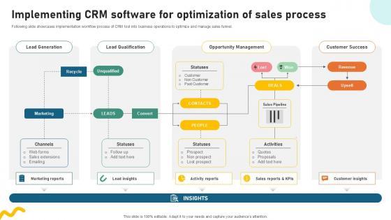 Following slide showcases implementation workflow process of CRM tool into business operations to optimize and manage sales funnel. Are you in need of a template that can accommodate all of your creative concepts This one is crafted professionally and can be altered to fit any style. Use it with Google Slides or PowerPoint. Include striking photographs, symbols, depictions, and other visuals. Fill, move around, or remove text boxes as desired. Test out color palettes and font mixtures. Edit and save your work, or work with colleagues. Download Implementing Crm Software For Sample Pitch Deck For Video Ppt Slide and observe how to make your presentation outstanding. Give an impeccable presentation to your group and make your presentation unforgettable. Following slide showcases implementation workflow process of CRM tool into business operations to optimize and manage sales funnel.