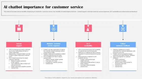 This slide showcases various benefits of deploying AI chatbot for customer service. Key benefits of chatbot deployment are instant support, minimize customer service expenses, 24 7 availability and collect customer feedback Retrieve professionally designed AI Chatbot Importance For Customer AI Bot Application For Various Industries Background Pdf to effectively convey your message and captivate your listeners. Save time by selecting pre made slideshows that are appropriate for various topics, from business to educational purposes. These themes come in many different styles, from creative to corporate, and all of them are easily adjustable and can be edited quickly. Access them as PowerPoint templates or as Google Slides themes. You do not have to go on a hunt for the perfect presentation because Slidegeeks got you covered from everywhere. This slide showcases various benefits of deploying AI chatbot for customer service. Key benefits of chatbot deployment are instant support, minimize customer service expenses, 24 7 availability and collect customer feedback
