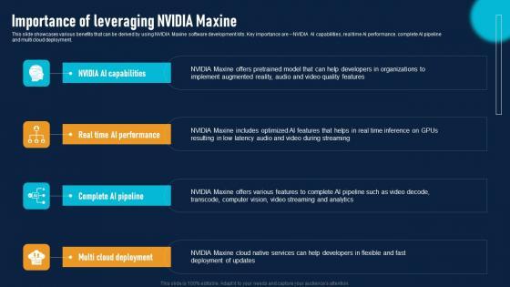 This slide showcases various benefits that can be derived by using NVIDIA Maxine software development kits. Key importance are NVIDIA AI capabilities, real time AI performance. complete AI pipeline and multi cloud deployment. Slidegeeks has constructed Importance Of Leveraging NVIDIA AI To Improve Virtual Communication Experience Clipart Pdf after conducting extensive research and examination. These presentation templates are constantly being generated and modified based on user preferences and critiques from editors. Here, you will find the most attractive templates for a range of purposes while taking into account ratings and remarks from users regarding the content. This is an excellent jumping off point to explore our content and will give new users an insight into our top notch PowerPoint Templates. This slide showcases various benefits that can be derived by using NVIDIA Maxine software development kits. Key importance are NVIDIA AI capabilities, real time AI performance. complete AI pipeline and multi cloud deployment.
