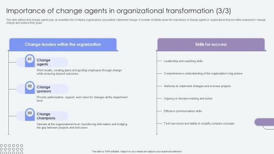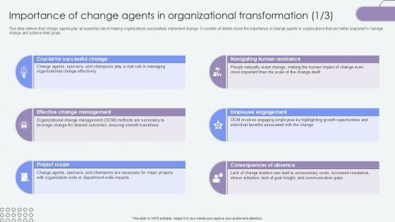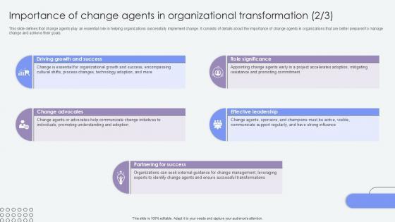 This slide defines that change agents play an essential role in helping organizations successfully implement change. It consists of details about the importance of change agents in organizations that are better prepared to manage change and achieve their goals. This modern and well-arranged Importance Of Change Agents In Agents Of Change Pioneers PPT Template CM SS V provides lots of creative possibilities. It is very simple to customize and edit with the Powerpoint Software. Just drag and drop your pictures into the shapes. All facets of this template can be edited with Powerpoint, no extra software is necessary. Add your own material, put your images in the places assigned for them, adjust the colors, and then you can show your slides to the world, with an animated slide included. This slide defines that change agents play an essential role in helping organizations successfully implement change. It consists of details about the importance of change agents in organizations that are better prepared to manage change and achieve their goals.