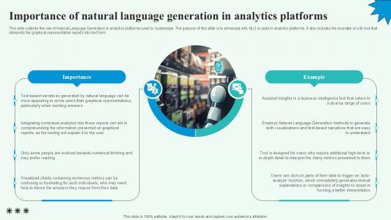 This slide outlines the role of Natural Language Generation in analytics platforms used by businesses. The purpose of this slide is to showcase why NLG is used in analytics platforms. It also includes the example of a BI tool that interprets the graphical representation reports into text form. Welcome to our selection of the Importance Of Natural Automated Content Generation PPT Sample. These are designed to help you showcase your creativity and bring your sphere to life. Planning and Innovation are essential for any business that is just starting out. This collection contains the designs that you need for your everyday presentations. All of our PowerPoints are 100Percent editable, so you can customize them to suit your needs. This multi-purpose template can be used in various situations. Grab these presentation templates today. This slide outlines the role of Natural Language Generation in analytics platforms used by businesses. The purpose of this slide is to showcase why NLG is used in analytics platforms. It also includes the example of a BI tool that interprets the graphical representation reports into text form.