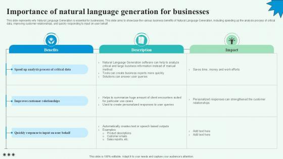 This slide represents why Natural Language Generation is essential for businesses. This slide aims to showcase the various business benefits of Natural Language Generation, including speeding up the analysis process of critical data, improving customer relationships, and quickly responding to input on user behalf Explore a selection of the finest Importance Of Natural Language Generation For Businesses AI Content Creation It Ppt Presentation here. With a plethora of professionally designed and pre-made slide templates, you can quickly and easily find the right one for your upcoming presentation. You can use our Importance Of Natural Language Generation For Businesses AI Content Creation It Ppt Presentation to effectively convey your message to a wider audience. Slidegeeks has done a lot of research before preparing these presentation templates. The content can be personalized and the slides are highly editable. Grab templates today from Slidegeeks. This slide represents why Natural Language Generation is essential for businesses. This slide aims to showcase the various business benefits of Natural Language Generation, including speeding up the analysis process of critical data, improving customer relationships, and quickly responding to input on user behalf