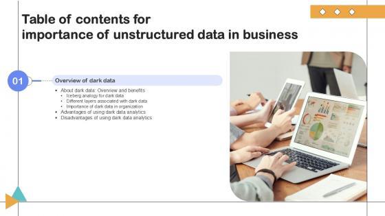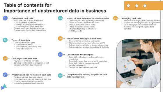 Find a pre-designed and impeccable Table Of Contents Importance Of Unstructured Data In Business Ppt Example. The templates can ace your presentation without additional effort. You can download these easy-to-edit presentation templates to make your presentation stand out from others. So, what are you waiting for Download the template from Slidegeeks today and give a unique touch to your presentation. Our Table Of Contents Importance Of Unstructured Data In Business Ppt Example are topically designed to provide an attractive backdrop to any subject. Use them to look like a presentation pro.