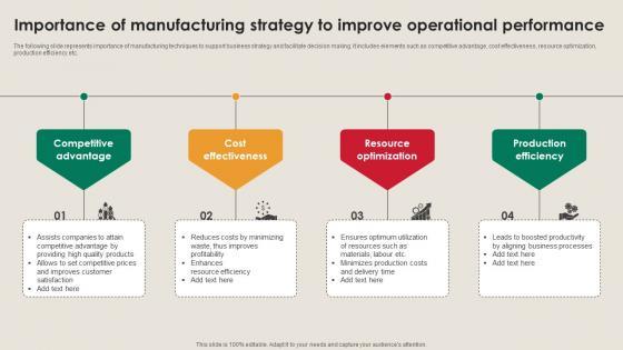 The following slide represents importance of manufacturing techniques to support business strategy and facilitate decision making. It includes elements such as competitive advantage, cost effectiveness, resource optimization, production efficiency etc. This modern and well-arranged Importance Of Manufacturing Strategy To Improve Manufacturing Strategy Driving Industry 4 0 provides lots of creative possibilities. It is very simple to customize and edit with the Powerpoint Software. Just drag and drop your pictures into the shapes. All facets of this template can be edited with Powerpoint, no extra software is necessary. Add your own material, put your images in the places assigned for them, adjust the colors, and then you can show your slides to the world, with an animated slide included. The following slide represents importance of manufacturing techniques to support business strategy and facilitate decision making. It includes elements such as competitive advantage, cost effectiveness, resource optimization, production efficiency etc.
