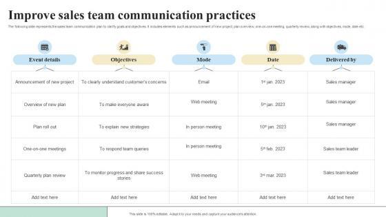 The following slide represents the sales team communication plan to clarify goals and objectives. It includes elements such as announcement of new project, plan overview, one-on-one meeting, quarterly review, along with objectives, mode, date etc. Make sure to capture your audiences attention in your business displays with our gratis customizable Improve Sales Team Communication Objectives And Key Result Methodology For Business. These are great for business strategies, office conferences, capital raising or task suggestions. If you desire to acquire more customers for your tech business and ensure they stay satisfied, create your own sales presentation with these plain slides. The following slide represents the sales team communication plan to clarify goals and objectives. It includes elements such as announcement of new project, plan overview, one-on-one meeting, quarterly review, along with objectives, mode, date etc.