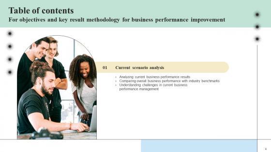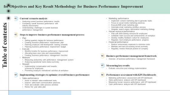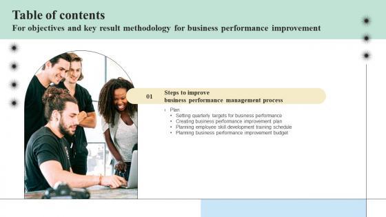 Here you can discover an assortment of the finest PowerPoint and Google Slides templates. With these templates, you can create presentations for a variety of purposes while simultaneously providing your audience with an eye-catching visual experience. Download Table Of Contents Objectives And Key Result Methodology For Business Performance Improvement to deliver an impeccable presentation. These templates will make your job of preparing presentations much quicker, yet still, maintain a high level of quality. Slidegeeks has experienced researchers who prepare these templates and write high-quality content for you. Later on, you can personalize the content by editing the Table Of Contents Objectives And Key Result Methodology For Business Performance Improvement. Our Table Of Contents Objectives And Key Result Methodology For Business Performance Improvement are topically designed to provide an attractive backdrop to any subject. Use them to look like a presentation pro.