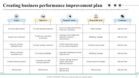 The following slide depicts the business performance improvement plan to fill gap and achieve expected results. It includes elements such as targets, objectives, required actions, responsible head, operating expenses, profitability, new skills etc. Present like a pro with Creating Business Performance Improvement Objectives And Key Result Methodology For Business. Create beautiful presentations together with your team, using our easy-to-use presentation slides. Share your ideas in real-time and make changes on the fly by downloading our templates. So whether you are in the office, on the go, or in a remote location, you can stay in sync with your team and present your ideas with confidence. With Slidegeeks presentation got a whole lot easier. Grab these presentations today. The following slide depicts the business performance improvement plan to fill gap and achieve expected results. It includes elements such as targets, objectives, required actions, responsible head, operating expenses, profitability, new skills etc.