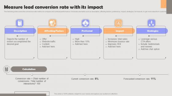 The following slide covers the conversion rate metrics to compare and contrast performance. It includes elements such as description, affecting factors, preference, impact, strategies, formula etc. to get more value from customers. The Improving PPC Campaign Results Measure Lead Conversion Rate With Its Impact Microsoft Pdf is a compilation of the most recent design trends as a series of slides. It is suitable for any subject or industry presentation, containing attractive visuals and photo spots for businesses to clearly express their messages. This template contains a variety of slides for the user to input data, such as structures to contrast two elements, bullet points, and slides for written information. Slidegeeks is prepared to create an impression. The following slide covers the conversion rate metrics to compare and contrast performance. It includes elements such as description, affecting factors, preference, impact, strategies, formula etc. to get more value from customers.