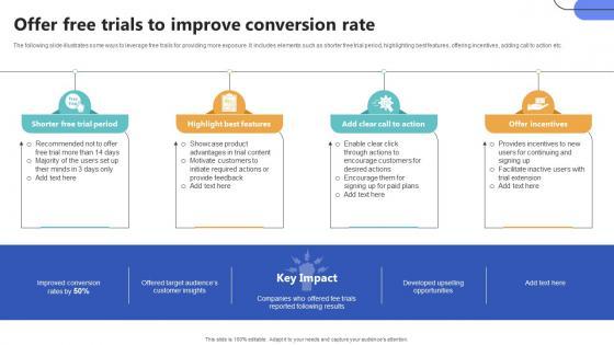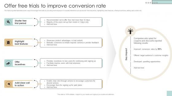 The following slide illustrates some ways to leverage free trails for providing more exposure. It includes elements such as shorter free trial period, highlighting best features, offering incentives, adding call to action etc.Presenting this PowerPoint presentation, titled Offer Free Trials To Improve Conversion Rate Comprehensive Guide To Implement Strategy SS V, with topics curated by our researchers after extensive research. This editable presentation is available for immediate download and provides attractive features when used. Download now and captivate your audience. Presenting this Offer Free Trials To Improve Conversion Rate Comprehensive Guide To Implement Strategy SS V. Our researchers have carefully researched and created these slides with all aspects taken into consideration. This is a completely customizable Offer Free Trials To Improve Conversion Rate Comprehensive Guide To Implement Strategy SS V that is available for immediate downloading. Download now and make an impact on your audience. Highlight the attractive features available with our PPTs. The following slide illustrates some ways to leverage free trails for providing more exposure. It includes elements such as shorter free trial period, highlighting best features, offering incentives, adding call to action etc.
