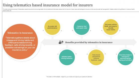 The slide presents summary of telematics based insurance to encourage better driving habits and decrease claims cost for insurers. It also caters advantages to insurers which are accurate risk management, initiates better driving behavior, conserve fuel and repair costs, etc. Here you can discover an assortment of the finest PowerPoint and Google Slides templates. With these templates, you can create presentations for a variety of purposes while simultaneously providing your audience with an eye-catching visual experience. Download Improving Customer Satisfaction Using Telematics Based Insurance Model For Insurers to deliver an impeccable presentation. These templates will make your job of preparing presentations much quicker, yet still, maintain a high level of quality. Slidegeeks has experienced researchers who prepare these templates and write high-quality content for you. Later on, you can personalize the content by editing the Improving Customer Satisfaction Using Telematics Based Insurance Model For Insurers. The slide presents summary of telematics based insurance to encourage better driving habits and decrease claims cost for insurers. It also caters advantages to insurers which are accurate risk management, initiates better driving behavior, conserve fuel and repair costs, etc.