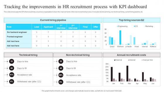 This slide showcases the KPIs that would help a business organization to track the improvements in the new recruitment process. It includes technical hiring,non-technical hiring,current hiring pipeline,etc.Welcome to our selection of the Tracking The Improvements In HR Recruitment Process Enhancing Workforce Demonstration Pdf These are designed to help you showcase your creativity and bring your sphere to life. Planning and Innovation are essential for any business that is just starting out. This collection contains the designs that you need for your everyday presentations. All of our PowerPoints are 100Precent editable,so you can customize them to suit your needs. This multi-purpose template can be used in various situations. Grab these presentation templates today. This slide showcases the KPIs that would help a business organization to track the improvements in the new recruitment process. It includes technical hiring, non-technical hiring, current hiring pipeline, etc.