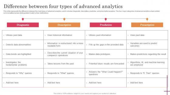 This slide represents the difference between the main types of advanced analytics, and it includes diagnostic, descriptive, predictive, and prescriptive analytics. The four major categories of advanced analytics share certain commonalities but are distinguished mostly by their distinctions. There are so many reasons you need a Difference Between Four Types Of Advanced Predictive Analytics For Improved Download Pdf. The first reason is you can not spend time making everything from scratch, Thus, Slidegeeks has made presentation templates for you too. You can easily download these templates from our website easily. This slide represents the difference between the main types of advanced analytics, and it includes diagnostic, descriptive, predictive, and prescriptive analytics. The four major categories of advanced analytics share certain commonalities but are distinguished mostly by their distinctions.