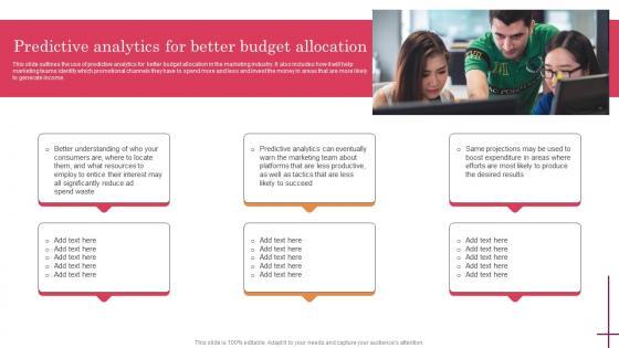 This slide outlines the use of predictive analytics for better budget allocation in the marketing industry. It also includes how it will help marketing teams identify which promotional channels they have to spend more and less and invest the money in areas that are more likely to generate income. Formulating a presentation can take up a lot of effort and time, so the content and message should always be the primary focus. The visuals of the PowerPoint can enhance the presenters message, so our Predictive Analytics For Better Budget Allocation Predictive Analytics For Improved Clipart Pdf was created to help save time. Instead of worrying about the design, the presenter can concentrate on the message while our designers work on creating the ideal templates for whatever situation is needed. Slidegeeks has experts for everything from amazing designs to valuable content, we have put everything into Predictive Analytics For Better Budget Allocation Predictive Analytics For Improved Clipart Pdf This slide outlines the use of predictive analytics for better budget allocation in the marketing industry. It also includes how it will help marketing teams identify which promotional channels they have to spend more and less and invest the money in areas that are more likely to generate income.