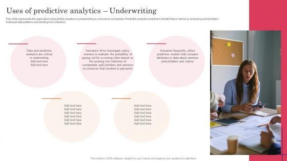 This slide represents the application of predictive analytics in underwriting by insurance companies. Predictive analytics help them identify future claims by analyzing policyholders historical data patterns and existing risk collection. Find highly impressive Uses Of Predictive Analytics Underwriting Predictive Analytics For Improved Slides Pdf on Slidegeeks to deliver a meaningful presentation. You can save an ample amount of time using these presentation templates. No need to worry to prepare everything from scratch because Slidegeeks experts have already done a huge research and work for you. You need to download Uses Of Predictive Analytics Underwriting Predictive Analytics For Improved Slides Pdf for your upcoming presentation. All the presentation templates are 100 percent editable and you can change the color and personalize the content accordingly. Download now. This slide represents the application of predictive analytics in underwriting by insurance companies. Predictive analytics help them identify future claims by analyzing policyholders historical data patterns and existing risk collection.