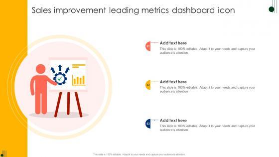 Showcasing this set of slides titled Sales Improvement Leading Metrics Dashboard Icon Ppt Summary Design Inspiration Pdf. The topics addressed in these templates are Sales Improvement Leading, Metrics Dashboard, Icon. All the content presented in this PPT design is completely editable. Download it and make adjustments in color, background, font etc. as per your unique business setting. Our Sales Improvement Leading Metrics Dashboard Icon Ppt Summary Design Inspiration Pdf are topically designed to provide an attractive backdrop to any subject. Use them to look like a presentation pro.