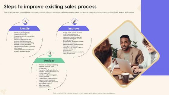 This slide showcases various phases in improving existing sales process to improve business performance and revenue growth. It includes phases such as identify, analyze and improve. This Steps To Improve Existing Sales Process Sales Performance Enhancement Icons Pdf from Slidegeeks makes it easy to present information on your topic with precision. It provides customization options, so you can make changes to the colors, design, graphics, or any other component to create a unique layout. It is also available for immediate download, so you can begin using it right away. Slidegeeks has done good research to ensure that you have everything you need to make your presentation stand out. Make a name out there for a brilliant performance. This slide showcases various phases in improving existing sales process to improve business performance and revenue growth. It includes phases such as identify, analyze and improve.