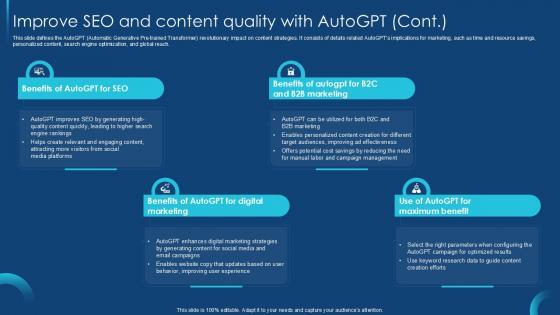 This slide defines the AutoGPT Automatic Generative Pre-trained Transformer revolutionary impact on content strategies. It consists of details related AutoGPTs implications for marketing, such as time and resource savings, personalized content, search engine optimization, and global reach. This modern and well-arranged Improve SEO And Content Quality Self Guided GPT 4 PPT Example CHATGPT SS V provides lots of creative possibilities. It is very simple to customize and edit with the Powerpoint Software. Just drag and drop your pictures into the shapes. All facets of this template can be edited with Powerpoint, no extra software is necessary. Add your own material, put your images in the places assigned for them, adjust the colors, and then you can show your slides to the world, with an animated slide included. This slide defines the AutoGPT Automatic Generative Pre-trained Transformer revolutionary impact on content strategies. It consists of details related AutoGPTs implications for marketing, such as time and resource savings, personalized content, search engine optimization, and global reach.