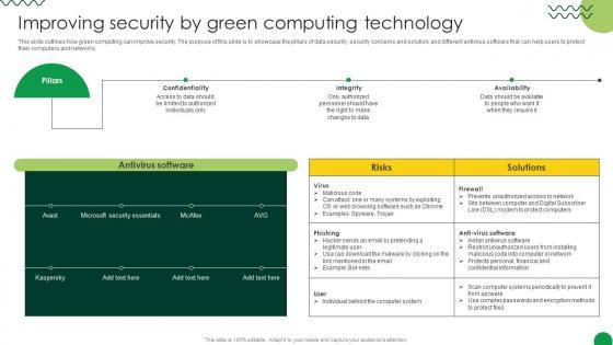 This slide outlines how green computing can improve security. The purpose of this slide is to showcase the pillars of data security, security concerns and solution, and different antivirus software that can help users to protect their computers and networks. Create an editable Sustainable Improving Security By Green Computing Technology that communicates your idea and engages your audience. Whether you are presenting a business or an educational presentation, pre-designed presentation templates help save time. Sustainable Improving Security By Green Computing Technology is highly customizable and very easy to edit, covering many different styles from creative to business presentations. Slidegeeks has creative team members who have crafted amazing templates. So, go and get them without any delay. This slide outlines how green computing can improve security. The purpose of this slide is to showcase the pillars of data security, security concerns and solution, and different antivirus software that can help users to protect their computers and networks.