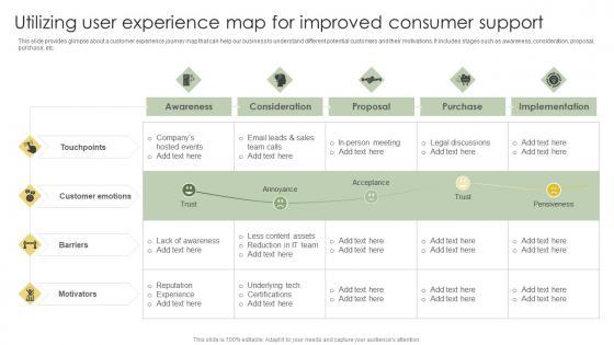 This slide provides glimpse about a customer experience journey map that can help our business to understand different potential customers and their motivations. It includes stages such as awareness, consideration, proposal, purchase, etc.Take your projects to the next level with our ultimate collection of Utilizing User Experience Map For Improved Consumer Support Analyzing Customer Ideas Pdf. Slidegeeks has designed a range of layouts that are perfect for representing task or activity duration, keeping track of all your deadlines at a glance. Tailor these designs to your exact needs and give them a truly corporate look with your own brand colors they all make your projects stand out from the rest. This slide provides glimpse about a customer experience journey map that can help our business to understand different potential customers and their motivations. It includes stages such as awareness, consideration, proposal, purchase, etc.