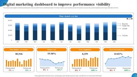 This slide covers digital marketing dashboard to improve performance visibility and sales. It involves details such as total number of sessions, bounce rate, goal completions and major channels over time. If you are looking for a format to display your unique thoughts, then the professionally designed Digital Marketing Dashboard To Improve Performance Visibility Brochure PDF is the one for you. You can use it as a Google Slides template or a PowerPoint template. Incorporate impressive visuals, symbols, images, and other charts. Modify or reorganize the text boxes as you desire. Experiment with shade schemes and font pairings. Alter, share or cooperate with other people on your work. Download Digital Marketing Dashboard To Improve Performance Visibility Brochure PDF and find out how to give a successful presentation. Present a perfect display to your team and make your presentation unforgettable.