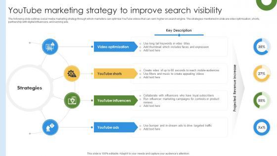 The following slide outlines social media marketing strategy through which marketers can optimize YouTube videos that can rank higher on search engine. The strategies mentioned in slide are video optimization, shorts, partnership with digital influencers, and running ads. Make sure to capture your audiences attention in your business displays with our gratis customizable Marketing Growth Strategy Youtube Marketing Strategy To Improve Search Visibility Strategy SS V. These are great for business strategies, office conferences, capital raising or task suggestions. If you desire to acquire more customers for your tech business and ensure they stay satisfied, create your own sales presentation with these plain slides. The following slide outlines social media marketing strategy through which marketers can optimize YouTube videos that can rank higher on search engine. The strategies mentioned in slide are video optimization, shorts, partnership with digital influencers, and running ads.