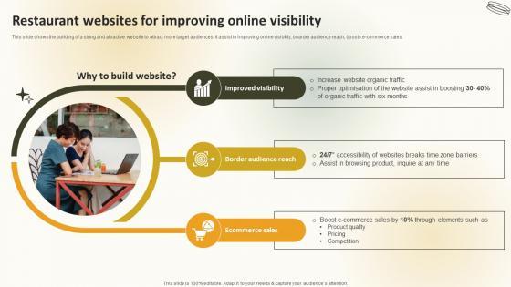 This slide shows the building of a string and attractive website to attract more target audiences. It assist in improving online visibility, boarder audience reach, boosts e-commerce sales. From laying roadmaps to briefing everything in detail, our templates are perfect for you. You can set the stage with your presentation slides. All you have to do is download these easy-to-edit and customizable templates. Create A Restaurant Marketing Restaurant Websites For Improving Online Visibility will help you deliver an outstanding performance that everyone would remember and praise you for. Do download this presentation today. This slide shows the building of a string and attractive website to attract more target audiences. It assist in improving online visibility, boarder audience reach, boosts e-commerce sales.