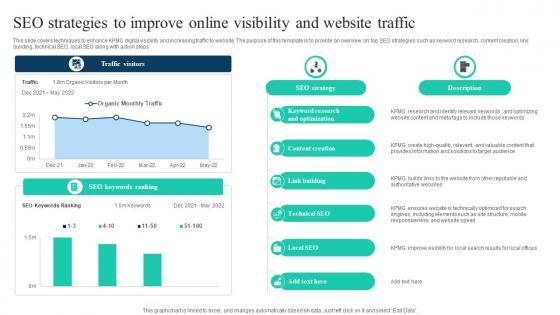 This slide covers techniques to enhance KPMG digital visibility and increasing traffic to website. The purpose of this template is to provide an overview on top SEO strategies such as keyword research, content creation, link building, technical SEO, local SEO along with action steps Are you searching for a SEO Strategies To Improve Online Visibility And Website Traffic Introduction PDF that is uncluttered, straightforward, and original Its easy to edit, and you can change the colors to suit your personal or business branding. For a presentation that expresses how much effort you have put in, this template is ideal With all of its features, including tables, diagrams, statistics, and lists, its perfect for a business plan presentation. Make your ideas more appealing with these professional slides. Download SEO Strategies To Improve Online Visibility And Website Traffic Introduction PDF from Slidegeeks today.