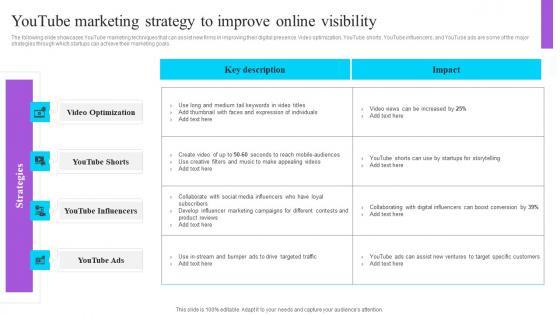 The following slide showcases YouTube marketing techniques that can assist new firms in improving their digital presence. Video optimization, YouTube shorts, YouTube influencers, and YouTube ads are some of the major strategies through which startups can achieve their marketing goals. There are so many reasons you need a Youtube Marketing Strategy To Improve Online Visibility Effective GTM Techniques Formats PDF. The first reason is you can not spend time making everything from scratch, Thus, Slidegeeks has made presentation templates for you too. You can easily download these templates from our website easily. The following slide showcases YouTube marketing techniques that can assist new firms in improving their digital presence. Video optimization, YouTube shorts, YouTube influencers, and YouTube ads are some of the major strategies through which startups can achieve their marketing goals.
