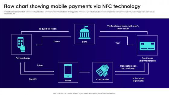 This slide shows details which can be used to understand how near field communication technology works in mobile payments. It includes various components such as mobile phone, payment app, bank, card issuer, card reader, etc. The Wireless Banking To Improve Flow Chart Showing Mobile Payments Via Fin SS V is a compilation of the most recent design trends as a series of slides. It is suitable for any subject or industry presentation, containing attractive visuals and photo spots for businesses to clearly express their messages. This template contains a variety of slides for the user to input data, such as structures to contrast two elements, bullet points, and slides for written information. Slidegeeks is prepared to create an impression. This slide shows details which can be used to understand how near field communication technology works in mobile payments. It includes various components such as mobile phone, payment app, bank, card issuer, card reader, etc.