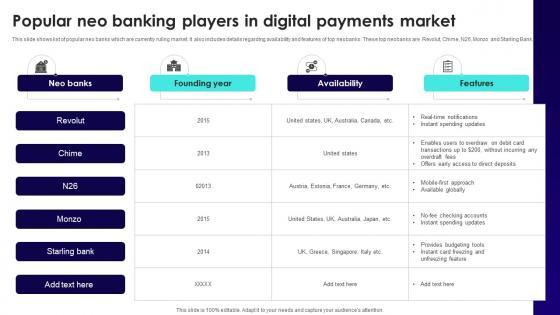 This slide shows list of popular neo banks which are currently ruling market. It also includes details regarding availability and features of top neobanks. These top neobanks are Revolut, Chime, N26, Monzo and Starling Bank. If you are looking for a format to display your unique thoughts, then the professionally designed Wireless Banking To Improve Popular Neo Banking Players In Digital Fin SS V is the one for you. You can use it as a Google Slides template or a PowerPoint template. Incorporate impressive visuals, symbols, images, and other charts. Modify or reorganize the text boxes as you desire. Experiment with shade schemes and font pairings. Alter, share or cooperate with other people on your work. Download Wireless Banking To Improve Popular Neo Banking Players In Digital Fin SS V and find out how to give a successful presentation. Present a perfect display to your team and make your presentation unforgettable. This slide shows list of popular neo banks which are currently ruling market. It also includes details regarding availability and features of top neobanks. These top neobanks are Revolut, Chime, N26, Monzo and Starling Bank.