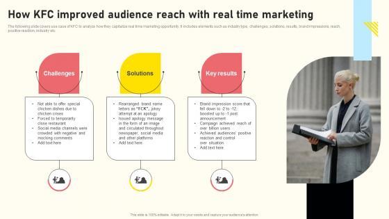 The following slide covers use case of KFC to analyze how they capitalize real time marketing opportunity. It includes elements such as industry type, challenges, solutions, results, brand impressions, reach, positive reaction, industry etc. Slidegeeks is here to make your presentations a breeze with Incorporating Real Time Marketing For Improved Consumer How Kfc Improved Audience Reach Icons PDF With our easy to use and customizable templates, you can focus on delivering your ideas rather than worrying about formatting. With a variety of designs to choose from, you are sure to find one that suits your needs. And with animations and unique photos, illustrations, and fonts, you can make your presentation pop. So whether you are giving a sales pitch or presenting to the board, make sure to check out Slidegeeks first.