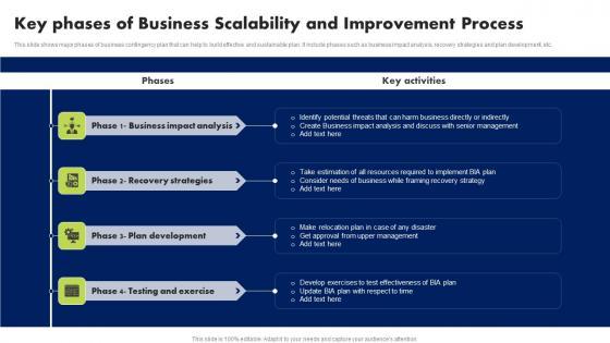 This slide shows major phases of business contingency plan that can help to build effective and sustainable plan. It include phases such as business impact analysis, recovery strategies and plan development, etc. Showcasing this set of slides titled Key Phases Of Business Scalability And Improvement Process Clipart Pdf. The topics addressed in these templates are Business Impact Analysis, Recovery Strategies, Plan Development. All the content presented in this PPT design is completely editable. Download it and make adjustments in color, background, font etc. as per your unique business setting. This slide shows major phases of business contingency plan that can help to build effective and sustainable plan. It include phases such as business impact analysis, recovery strategies and plan development, etc.
