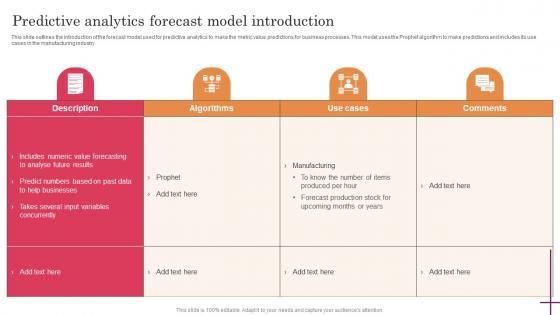 This slide outlines the introduction of the forecast model used for predictive analytics to make the metric value predictions for business processes. This model uses the Prophet algorithm to make predictions and includes its use cases in the manufacturing industry. This modern and well-arranged Predictive Analytics Forecast Model Introduction Predictive Analytics For Improved Rules Pdf provides lots of creative possibilities. It is very simple to customize and edit with the Powerpoint Software. Just drag and drop your pictures into the shapes. All facets of this template can be edited with Powerpoint no extra software is necessary. Add your own material, put your images in the places assigned for them, adjust the colors, and then you can show your slides to the world, with an animated slide included. This slide outlines the introduction of the forecast model used for predictive analytics to make the metric value predictions for business processes. This model uses the Prophet algorithm to make predictions and includes its use cases in the manufacturing industry.