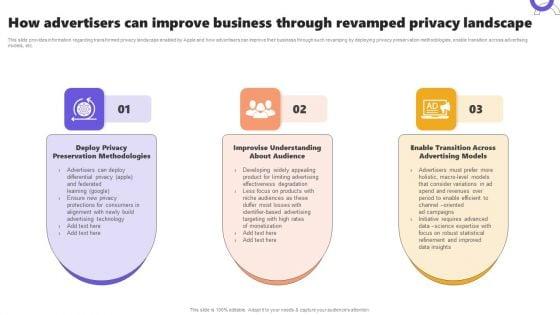 This slide provides information regarding transformed privacy landscape enabled by Apple and how advertisers can improve their business through such revamping by deploying privacy preservation methodologies, enable transition across advertising models, etc. There are so many reasons you need a How Advertisers Can Improve Business Through Revamped Privacy Landscape Rules PDF. The first reason is you cannot spend time making everything from scratch, Thus, Slidegeeks has made presentation templates for you too. You can easily download these templates from our website easily.