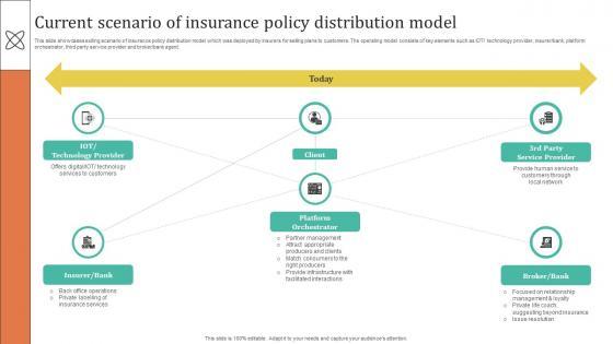 This slide showcases exiting scenario of insurance policy distribution model which was deployed by insurers for selling plans to customers. The operating model consists of key elements such as IOT technology provider, insurer bank, platform orchestrator, third party service provider and broker bank agent. If you are looking for a format to display your unique thoughts, then the professionally designed Improving Customer Satisfaction Current Scenario Of Insurance Policy Distribution is the one for you. You can use it as a Google Slides template or a PowerPoint template. Incorporate impressive visuals, symbols, images, and other charts. Modify or reorganize the text boxes as you desire. Experiment with shade schemes and font pairings. Alter, share or cooperate with other people on your work. Download Improving Customer Satisfaction Current Scenario Of Insurance Policy Distribution and find out how to give a successful presentation. Present a perfect display to your team and make your presentation unforgettable. This slide showcases exiting scenario of insurance policy distribution model which was deployed by insurers for selling plans to customers. The operating model consists of key elements such as IOT technology provider, insurer bank, platform orchestrator, third party service provider and broker bank agent.